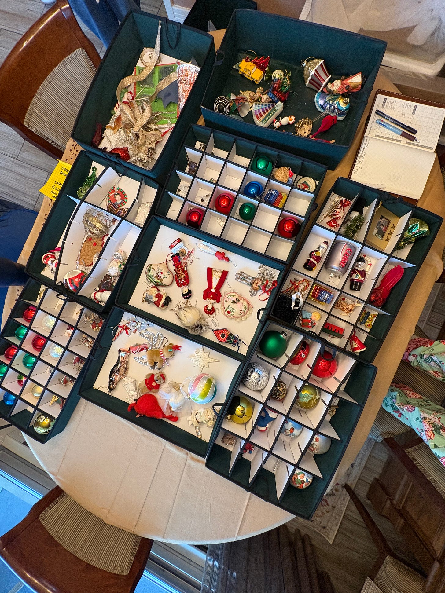 We canceled our extended family Christmas gathering on my mom’s side due to a case of the flu/strep in the host family. LET ME BE CLEAR, I am very glad we did not gather, but it’s a bummer all the same, because I love my family!!! My mom had shingles during the first half of December (“AARP members, get your shingles vaccination” - Melissa1). She brought her boxes of ornaments and garland and woodland animals up to her condo from her storage unit on a different floor in case we wanted to decorate when we were all together, but we decided against it (‘because we’ll just have to take it all down again in three days’ - fair). When we didn’t have anywhere to go on Christmas morning, we decided to complete THE GREAT CHRISTMAS ORNAMENT AUDIT OF 2025 before putting everything back downstairs. We’re an eclectic/memento ornament family: everything has a story. My mom wanted to sort the ornaments and label them by era or style, attaching an anecdote if indicated. Some of her categories included: